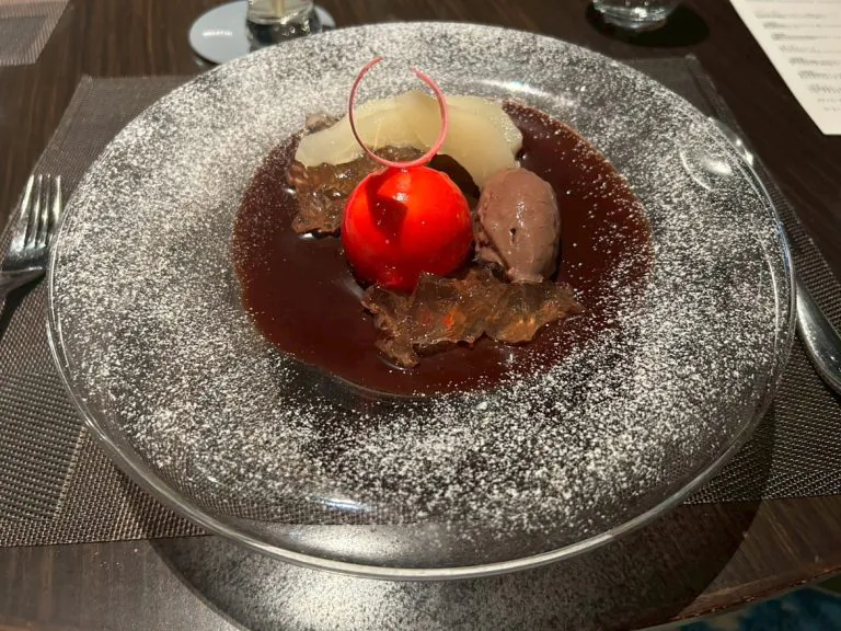 店内は落ち着いた照明でゆっくり会話を楽しむことができ、料理も一品一品の盛り付けが華やかで、最後のデザートまでおいしくいただきました。